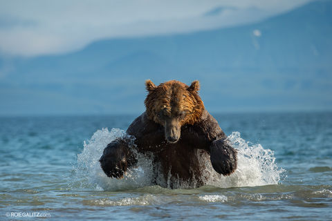 Photographing the Kamchatka bears is an experience of a lifetime. At Lake Kurile, I find myself face to face with these magnificent creatures, with no barriers between us. It’s a profound moment to witness them in their natural habitat, observing as they skillfully catch salmon in preparation for the long winter hibernation. The proximity offers an unparalleled opportunity to capture intimate and dynamic images of these majestic animals in their element.